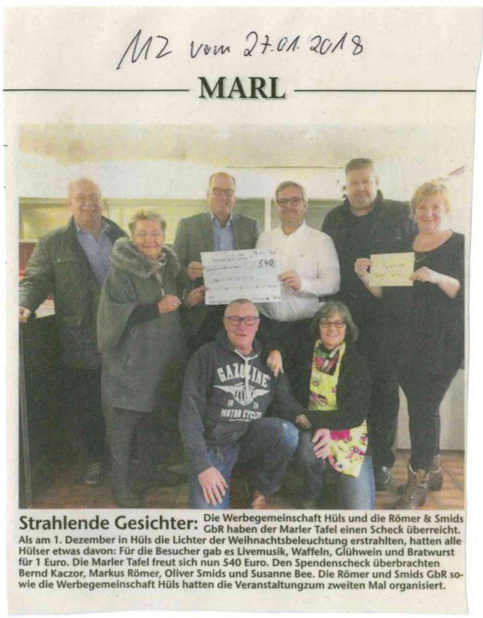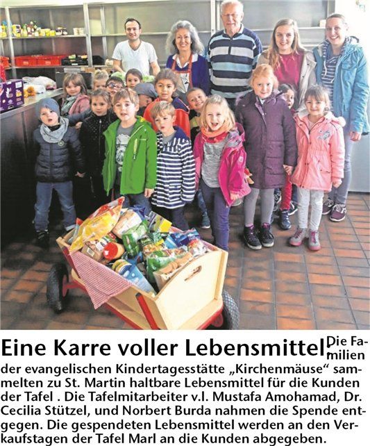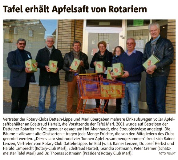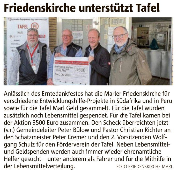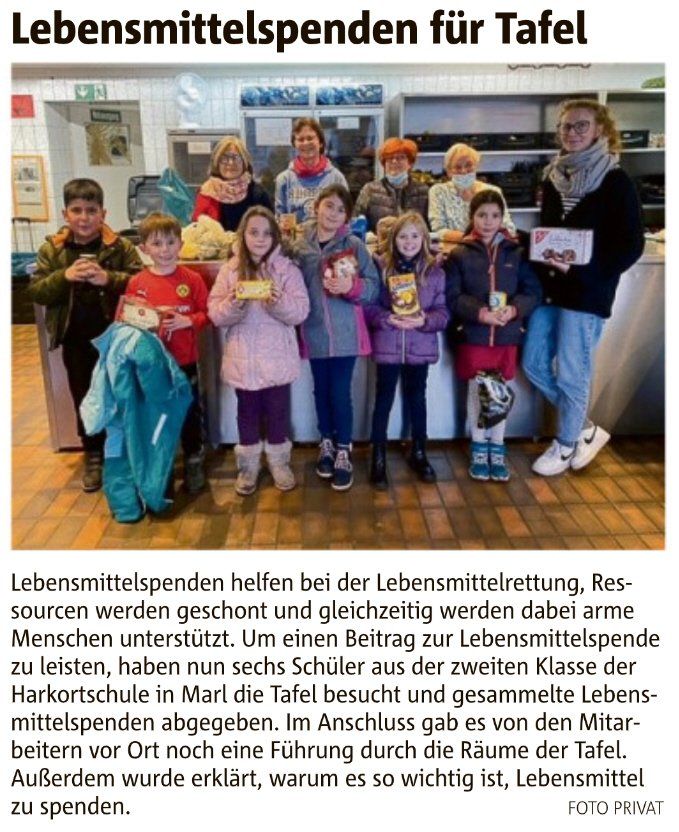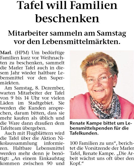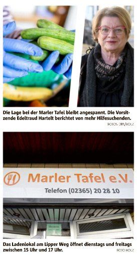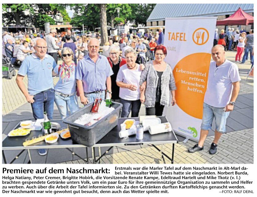 Tafel Marl: Die erste Tafel in Deutschland wurde 1993 nach dem Vorbild der New Yorker City Harvest in Berlin gegründet. Der Gedanke, Lebensmittel einzusammeln, die nach den Gesetzen der Marktlogik „überschüssig“ sind, und diese an bedürftige Menschen und soziale Einrichtungen weiterzugeben, schien einfach und sinnvoll. Heute unterstützen in Deutschland mit ehrenamtlichen Einsatz und mit Spenden rund 60.000 Menschen die über 900 Tafeln. In Marl zählt der Kreis der aktiven Unterstützer rund 100 Menschen. Internet: www.marler-tafel.de. Mail: info@marler-tafel.de