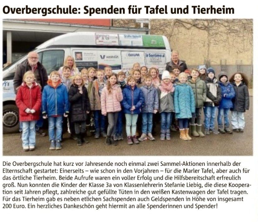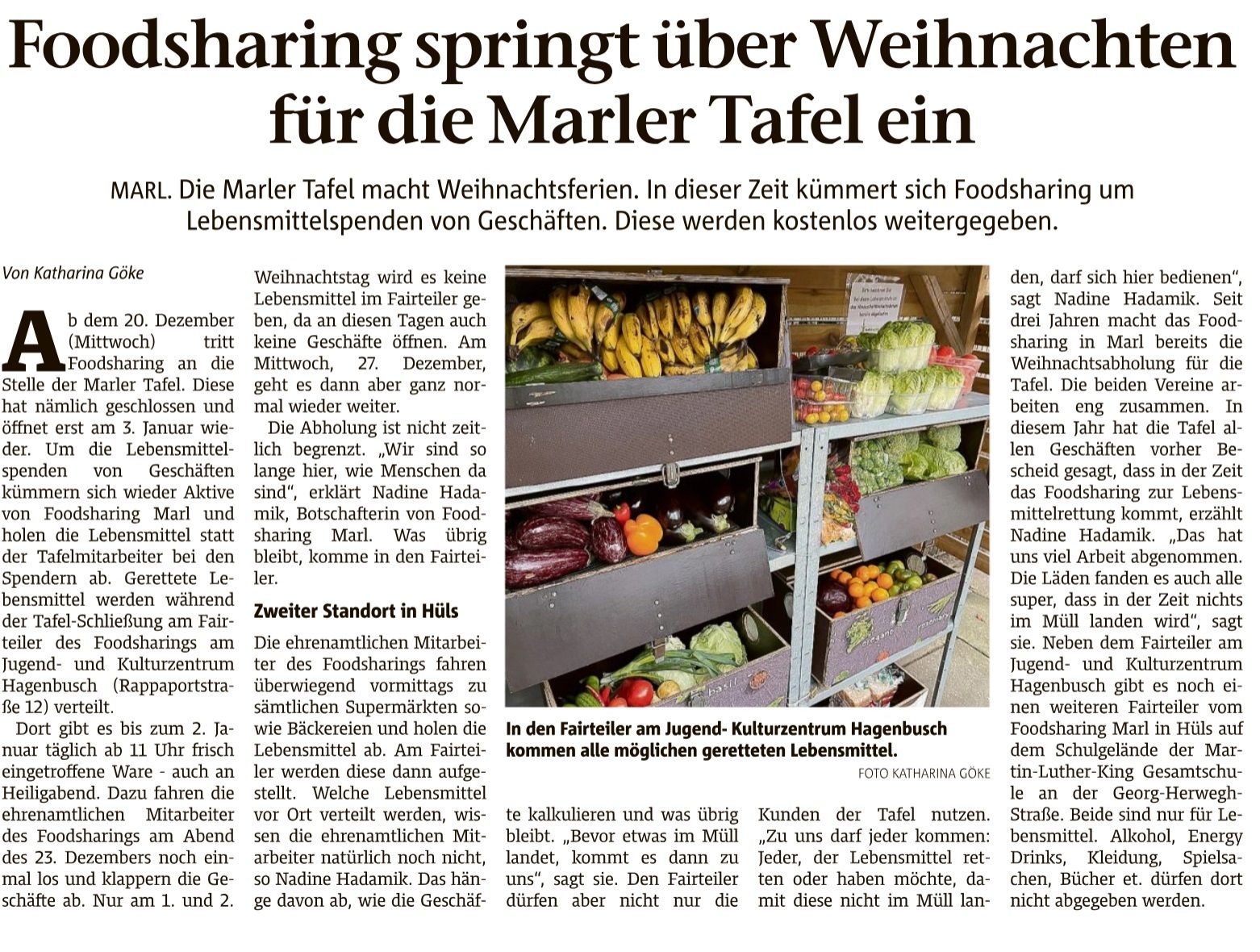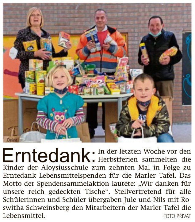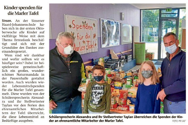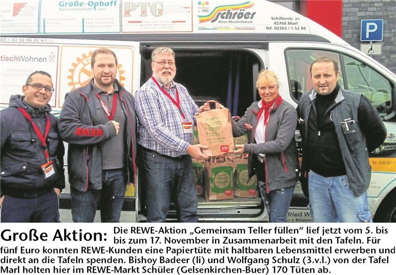 Tafel Marl: Die erste Tafel in Deutschland wurde 1993 nach dem Vorbild der New Yorker City Harvest in Berlin gegründet. Der Gedanke, Lebensmittel einzusammeln, die nach den Gesetzen der Marktlogik „überschüssig“ sind, und diese an bedürftige Menschen und soziale Einrichtungen weiterzugeben, schien einfach und sinnvoll. Heute unterstützen in Deutschland mit ehrenamtlichen Einsatz und mit Spenden rund 60.000 Menschen die über 900 Tafeln. In Marl zählt der Kreis der aktiven Unterstützer rund 100 Menschen. Internet: www.marler-tafel.de. Mail: info@marler-tafel.de