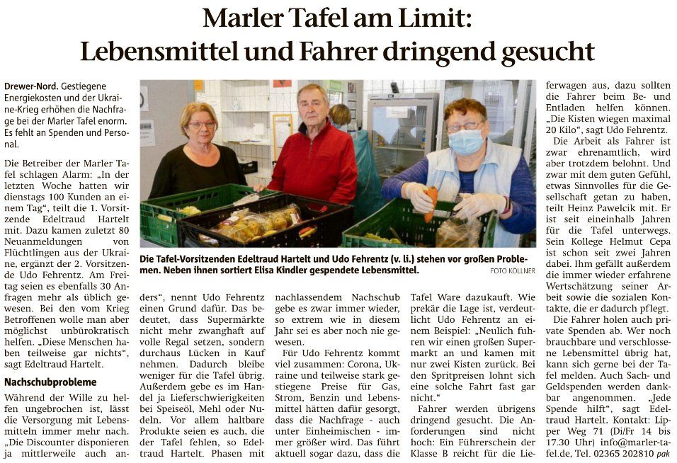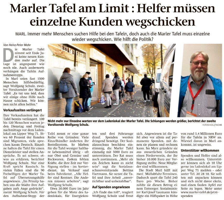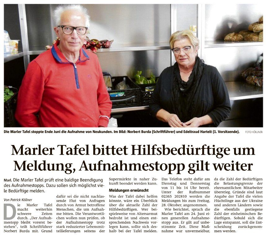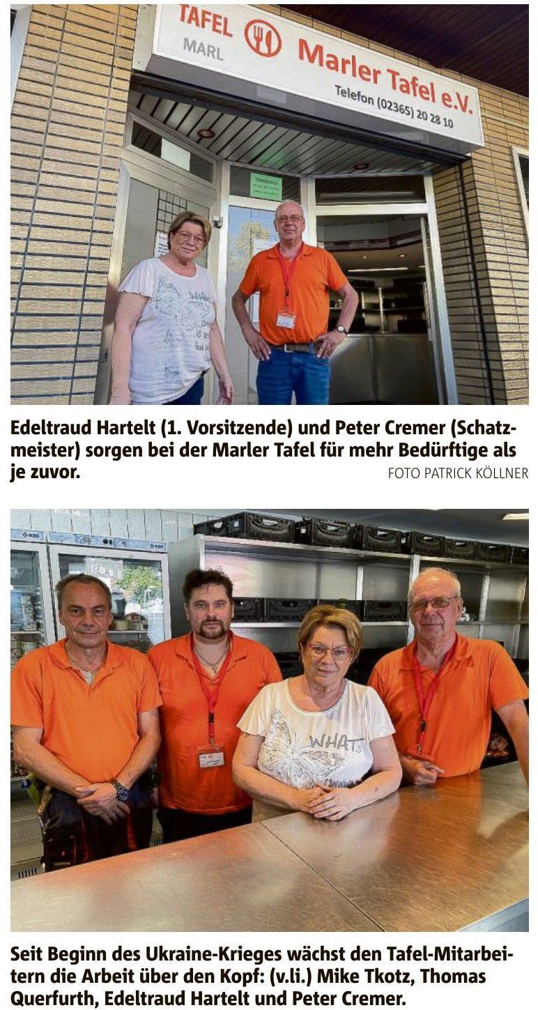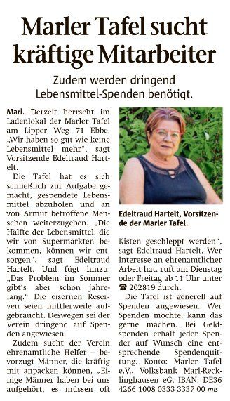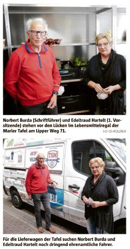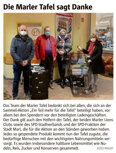 Die Tafel Marl sammelt Lebensmittel, welche im Wirtschaftskreislauf nicht mehr verwendet und ansonsten vernichtet würden, und verteilt diese an Bedürftige. Durch gezielte Hilfe trägt hier der 2021 gegründete Verein zur Förderung der Tafel Marl e.V. Jahr für Jahr dazu bei, einen gut funktionierten Tafelbetrieb, trotz einer schwierigen Situation, u.a. mit gespendeten Geld zu unterstützen und aufrecht zu erhalten. Die bisherige Vorsitzende Edeltraud Hartelt (bisher in Doppelfunktion auch für die Tafel Marl e. V. tätig) wurde verabschiedet. Der neue Vorstand setzt sich wie folgt zusammen:
