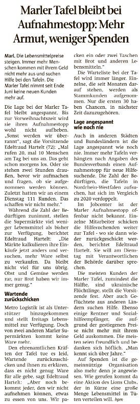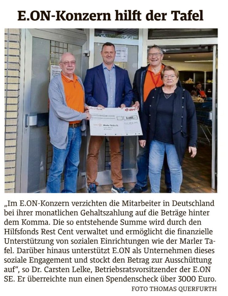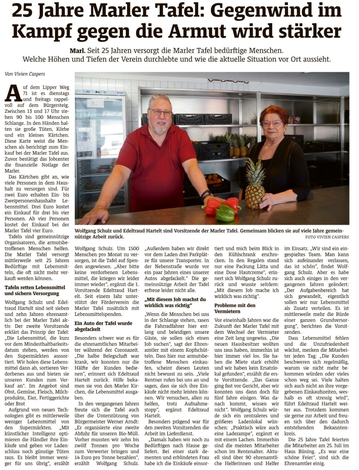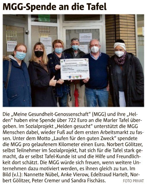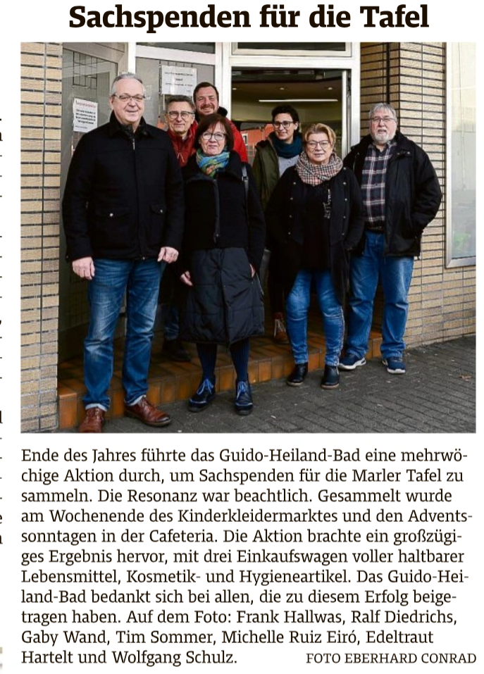 Die Tafel Marl sammelt Lebensmittel, welche im Wirtschaftskreislauf nicht mehr verwendet und ansonsten vernichtet würden, und verteilt diese an Bedürftige. Durch gezielte Hilfe trägt hier der 2021 gegründete Verein zur Förderung der Tafel Marl e.V. Jahr für Jahr dazu bei, einen gut funktionierten Tafelbetrieb, trotz einer schwierigen Situation, u.a. mit gespendeten Geld zu unterstützen und aufrecht zu erhalten. Die bisherige Vorsitzende Edeltraud Hartelt (bisher in Doppelfunktion auch für die Tafel Marl e. V. tätig) wurde verabschiedet. Der neue Vorstand setzt sich wie folgt zusammen: