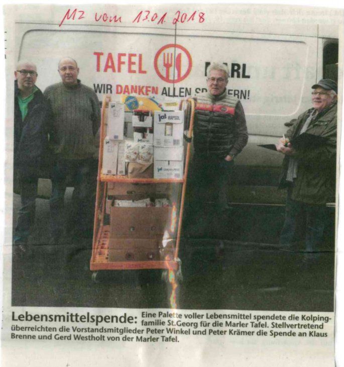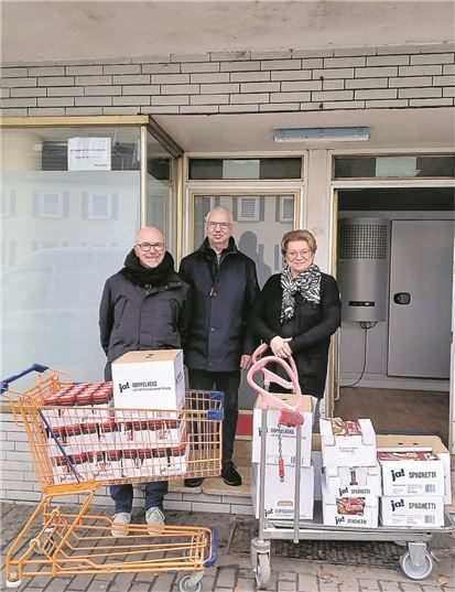 UM DIE WICHTIGE ARBEIT DER MARLER TAFEL ZU UNTERSTÜTZEN, SPENDETE DIE KOLPINGFAMILIE ST. GEORG LEBENSMITTEL. DIE VORSTANDSMITGLIEDER PETER KRÄMER (1. KASSIERER, L.) UND KLAUS-WERNER GENSTER (1. SCHRIFTFÜHRER) HABEN LEBENSMITTEL IM WERTE VON 350 EURO AN EDELTRAUD HARDELT (1. VORSITZENDE DER MARLER TAFEL) ÜBERGEBEN. FOTO PRIVAT