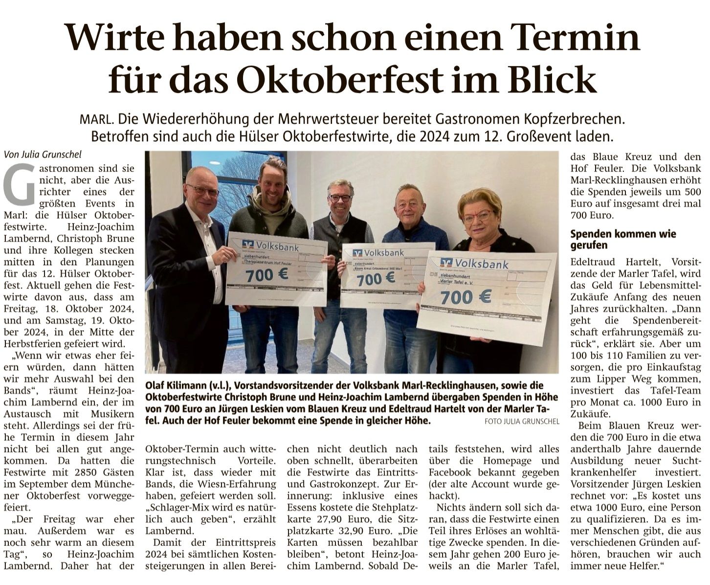 Wie die Hülser Oktoberfestwirte verdeutlichen, sei die Feier nicht nur fester Bestandteil des Marler Veranstaltungskalenders. Es gehe auch darum, die Feierfreude mit sozialem Engagement zu verbinden.