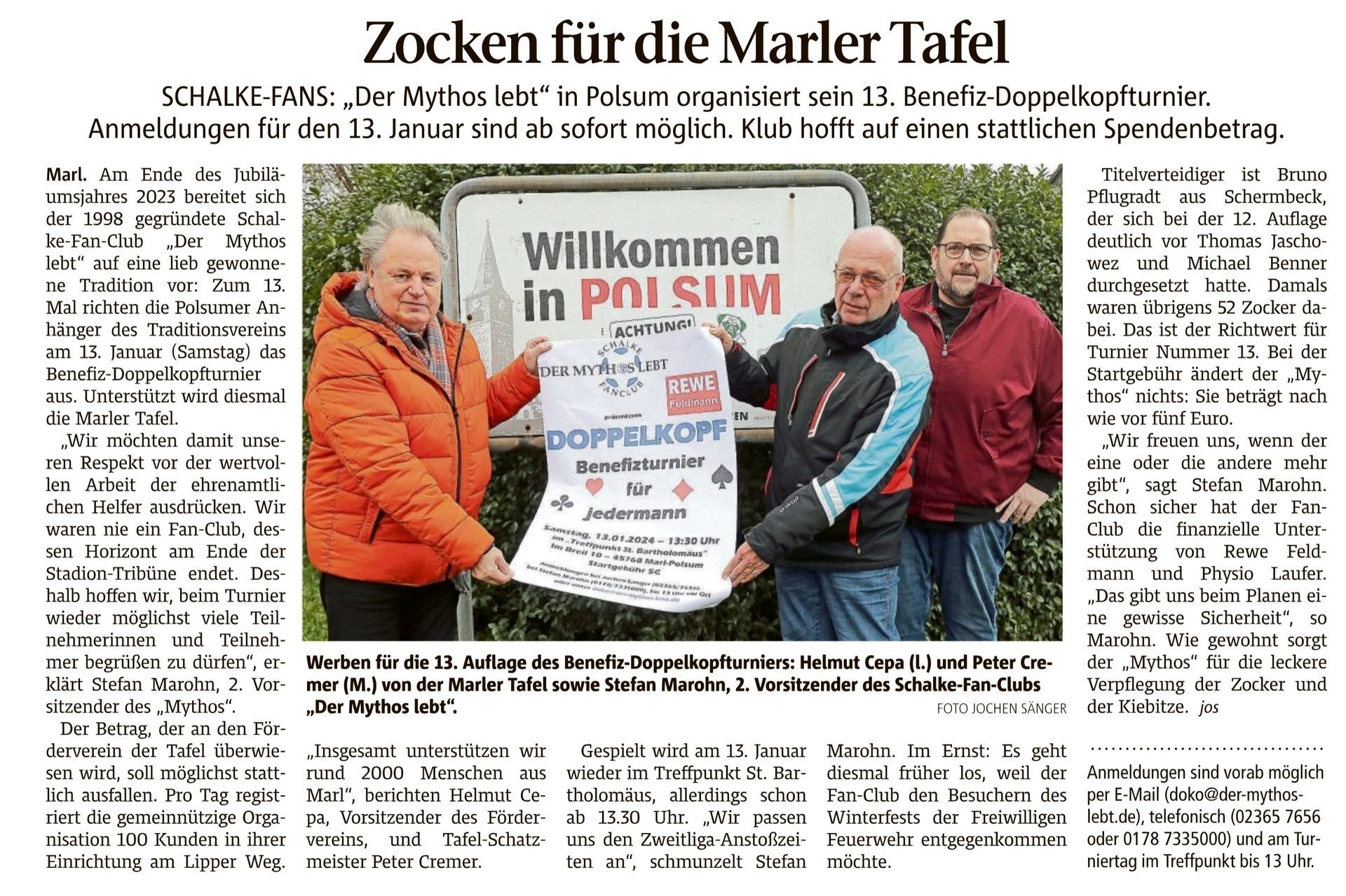 ANONYME SPENDER AUS ALT-MARL HABEN 1000 EURO BEIM REWE-MARKT TEKO FÜR DEN EINKAUF FRISCHER LEBENSMITTEL HINTERLEGT. JETZT WURDEN IN ABSPRACHE MIT MARKT UND TAFEL VERSCHIEDENE LEBENSMITTEL EINGEKAUFT. DIESE WURDEN VON DEN TAFELMITARBEITERN PETER CREMER (R.) UND THOMAS QUERFURTH (L.) MIT DEM LIEFERWAGEN ABGEHOLT. AN DEN ABGABETAGEN DIENSTAG UND FREITAG WERDEN DIESE SPENDEN AN DIE TAFELKUNDEN WEITERGEGEBEN. DURCH MEHRERE GELDSPENDEN ZUR WEIHNACHTSZEIT AN DIE TAFEL KÖNNEN IM JAHR 2023 WEITERE EINKAUFSAKTIONEN DURCHGEFÜHRT WERDE.