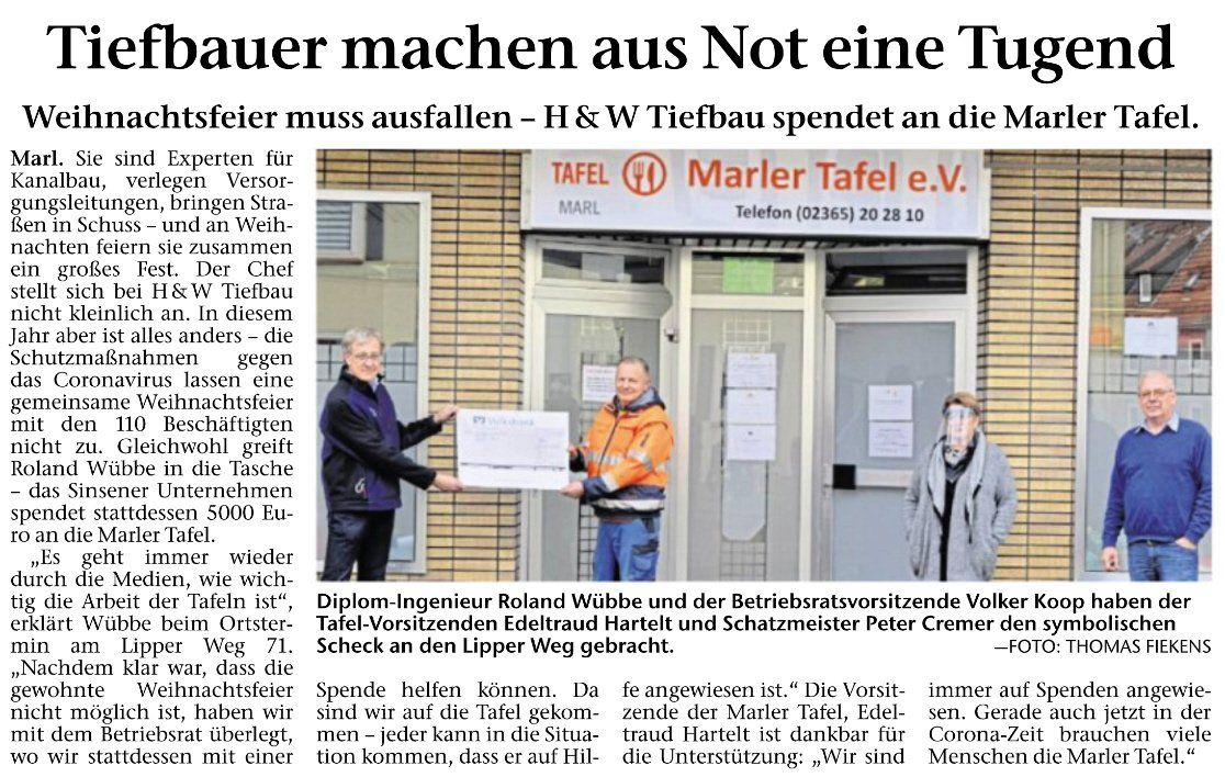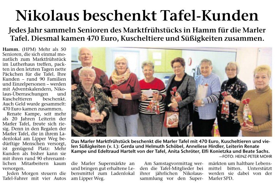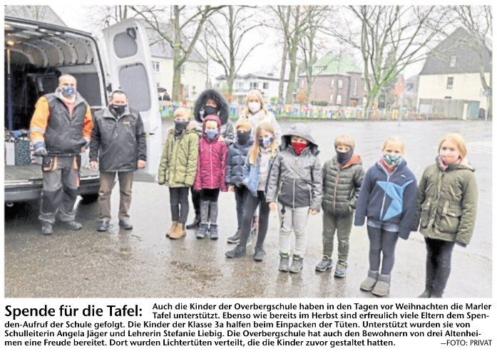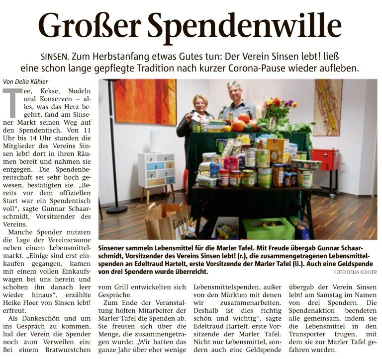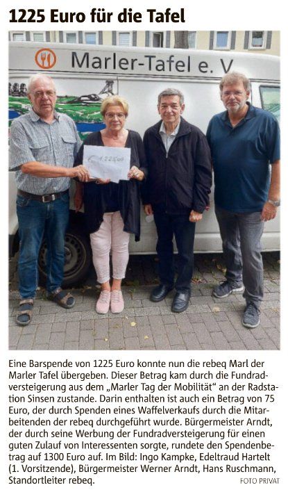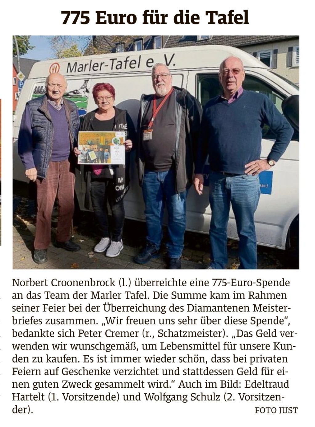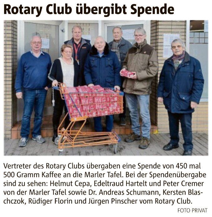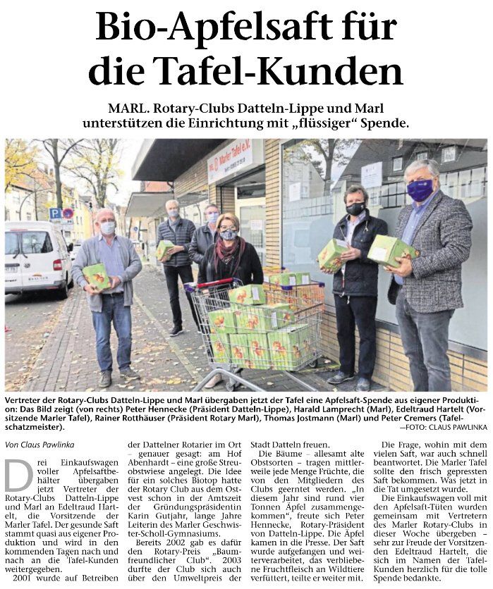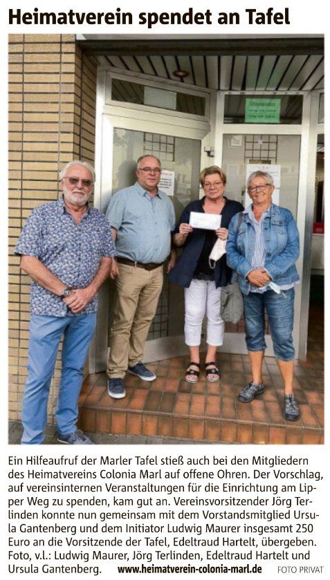 „Aus 1 mach 2 oder, statt 1000 € konnten wir zusammen 2000 € spenden, ergänzt Clubsekretärin Elke Fleckhaus. „Für uns und die Tafel eine mehr als nur erfreuliche Spendenaktion.“ Auch der Schriftführer der Tafel Marl, Norbert Burda, freut sich über die Hilfe zur richtigen Zeit: „Wir haben jetzt in den Zeiten des Lockdowns unsere Internetpräsenz www.marler-tafel.de mit vielen Informationen zu unserer Arbeit völlig neu strukturiert und können jetzt auch über diese Spenden und Projekte kompetent informieren.