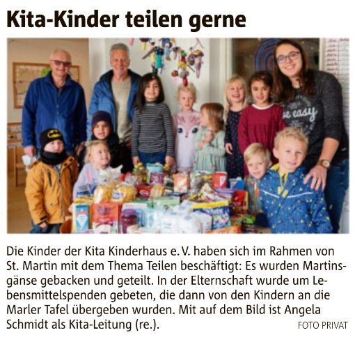 So lernen die 100 Kinder von St. Bartholomäus gleich auch die Organisation Marler Tafel in ihrer Heimatstadt kennen, die gespendete Lebensmittel an Bedürftige verteilt. Helfer aus dem Team der Tafel haben insgesamt viele Päckchen persönlich abgeholt. Norbert Burda vom Vorstand der Tafel freut sich, dass die Kita einen wesentlichen Grundsatz der Tafelbewegung erlebbar gemacht hat: „Das Geheimnis des Glücks liegt nicht im Besitz, sondern im Geben. Wer andere glücklich macht, wird glücklich.“