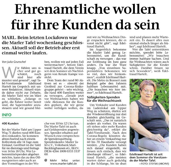 Zu Beginn der Corona Pandemie hatte auch die Tafel Marl mit vielen Problemen und Unwägbarkeiten zu kämpfen. Mittlerweile hat sich der „Betrieb“ nach Einschätzung der 1. Vorsitzenden der Marler Tafel, Edeltraud Hartelt, weitestgehend wieder normalisiert – natürlich vor dem Hintergrund der immer noch einschränkenden Kontaktbeschränkungen. Und genau diese Situation macht den Menschen, denen die Tafel Unterstützung gibt, stark zu schaffen, so dass Hilfen und Spenden gerade in der jetzigen Situation hoch willkommen sind.