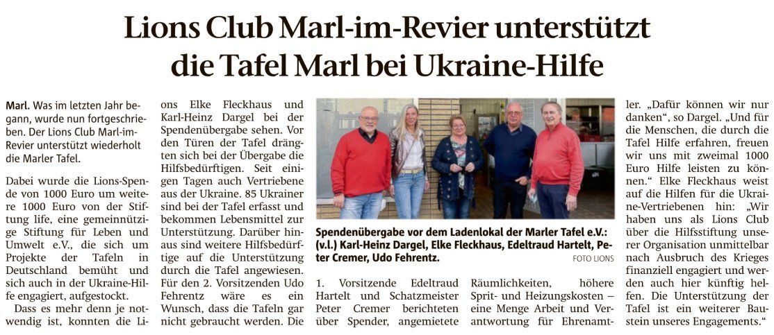 Dem hat auch der Lions Club Marl-Im-Revier jetzt mit einer Spendenübergabe Rechnung getragen. Dabei konnten die Marler Löwen einen glücklichen Umstand zur Aufstockung des eigenen Spendenbeitrags von 1.000 € nutzen. „Bei einer Internetrecherche bin ich auf die Organisation Stiftunglife und deren Aktion, Spenden der Lions bis 1000 € für die örtlichen Tafeln zu verdoppeln, gestoßen,“ erläutert Karl-Heinz Dargel, Schatzmeister des Lions Club Marl-im-Revier. „Die Kontaktaufnahme und Zusage der Verdoppelung war absolut unproblematisch, unbürokratisch und schnell. Ich persönlich bin begeistert von der Organisation Stiftunglife, die sich für lokale Umwelt- und Klimaprojekten in Myanmar, sowie bei den Tafeln Deutschlands engagiert. Besonders zu erwähnen ist dabei auch das s.g. „gläserne Konto“, das die Stiftung online über Ausgaben und Einnahmen führt.“