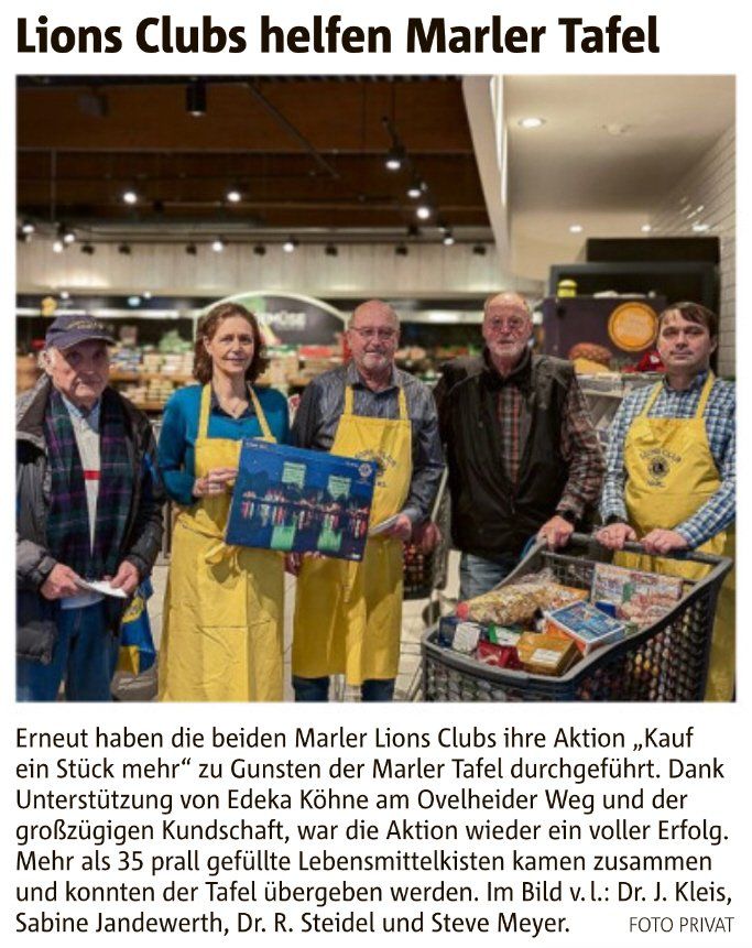 „Diese Spendenübergabe wird nicht die letzte bleiben,“ so Vize-Präsident Peter Gesser und fährt fort: „Wir kooperieren mit unserem Schwester-Club, dem Lions Club Marl schon seit einigen Jahren beim Sammeln von Lebensmittelspenden in der Vorweihnachtszeit. Auch diese Arbeit werden wir fortsetzen, weil wir das ehrenamtliche Engagement der über 100 Helfer der Tafel Marl schätzen.“