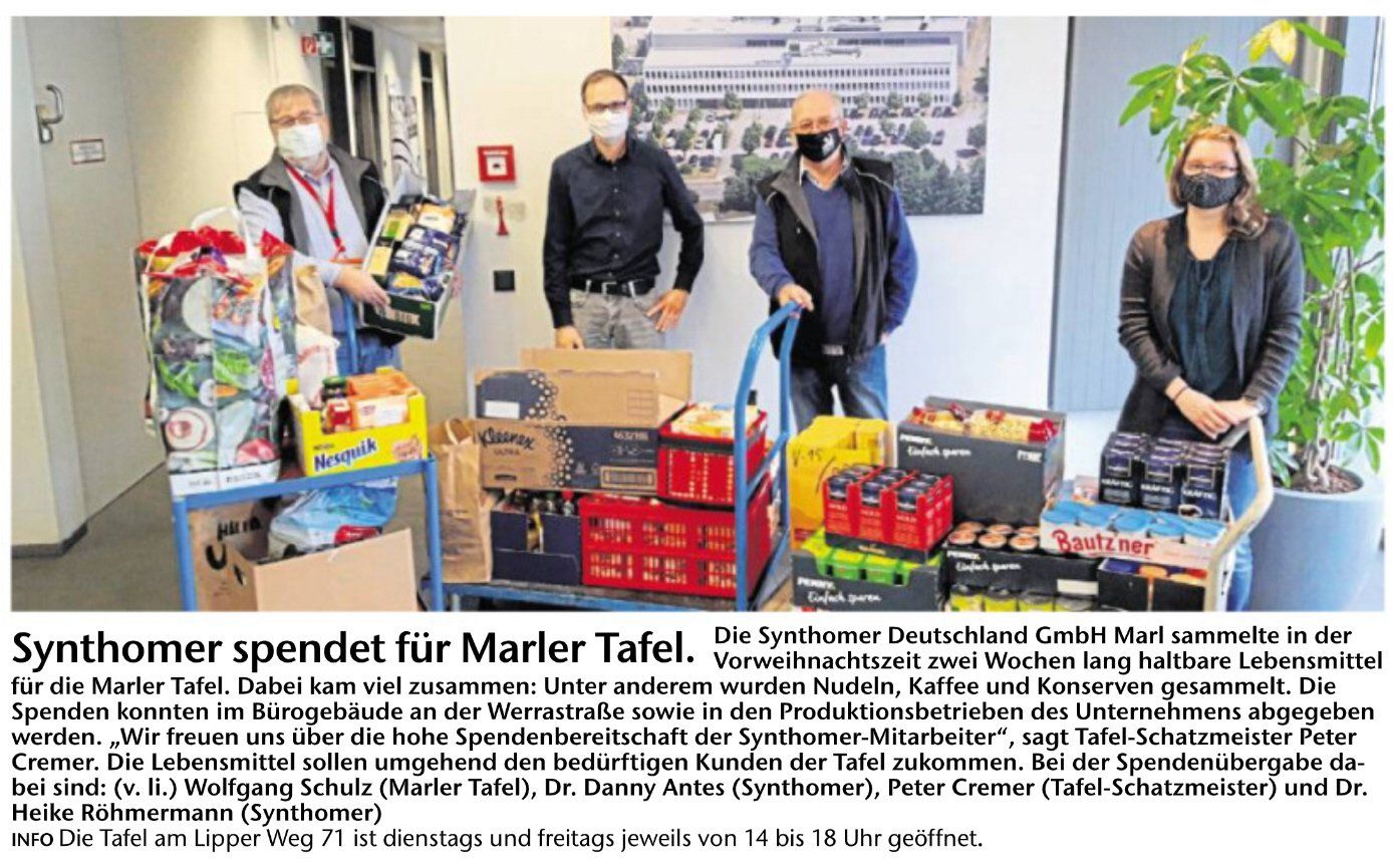 DIE MITARBEITENDEN DES CHEMIEUNTERNEHMENS SYNTHOMER DEUTSCHLAND IN MARL SAMMELTEN FÜR DIE TAFEL LEBENSMITTEL. BEI DER ÜBERGABE HOLTEN THOMAS QUERFURTH, PETER CREMER UND DR. DANNY ANTES DIE LEBENSMITTEL FÜR DIE TAFELKUNDEN AB. ZUSÄTZLICH KONNTEN VON DEN GELDSPENDEN LEBENSMITTEL IM WERT VON 450 EURO EINGEKAUFT WERDEN FOTOS PRIVAT