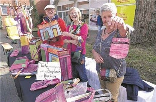 ZU SCHADE ZUM WEGWERFEN: DIE ALTEN BAUPLANEN DER SINSENER KREUZKIRCHEN-BAUSTELLE ERHIELTEN ALS ROBUSTE DESIGNER-TASCHEN EIN NEUES LEBEN. BEIM GUT BESUCHTEN MAIBAUMFEST DER SINSENER RUNDE WURDEN DIE FARBENFROHEN UNIKATE AM STAND DES KULTURVEREINS SINSENER ART. VERKAUFT, UMRAHMT DURCH BIER VOM FASS, BRATWÜRSTE VOM GRILL, BLASMUSIK UND BÜRGERMEISTER WERNER ARNDT, DER DIE VERANSTALTUNG ERÖFFNETE. AUCH ER TRUG EINE DER ÜBER VIERZIG TASCHEN NACH HAUSE. EINE NACHHALTIGE UPCYCLING-AKTION, BEI DER ÜBER 500 EURO FÜR DIE TAFEL ZUSAMMENKAMEN. foto PRIVAT