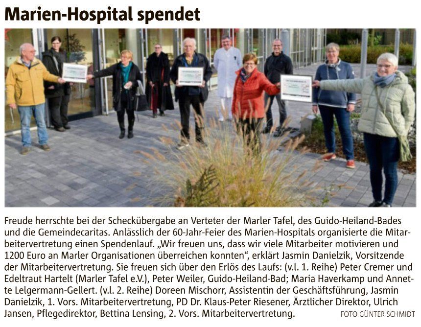 Die Tafel Marl sammelt Lebensmittel, welche im Wirtschaftskreislauf nicht mehr verwendet und ansonsten vernichtet würden, und verteilt diese an Bedürftige. Durch gezielte Hilfe trägt hier der 2021 gegründete Verein zur Förderung der Tafel Marl e.V. Jahr für Jahr dazu bei, einen gut funktionierten Tafelbetrieb, trotz einer schwierigen Situation, u.a. mit gespendeten Geld zu unterstützen und aufrecht zu erhalten. Die bisherige Vorsitzende Edeltraud Hartelt (bisher in Doppelfunktion auch für die Tafel Marl e. V. tätig) wurde verabschiedet. Der neue Vorstand setzt sich wie folgt zusammen: